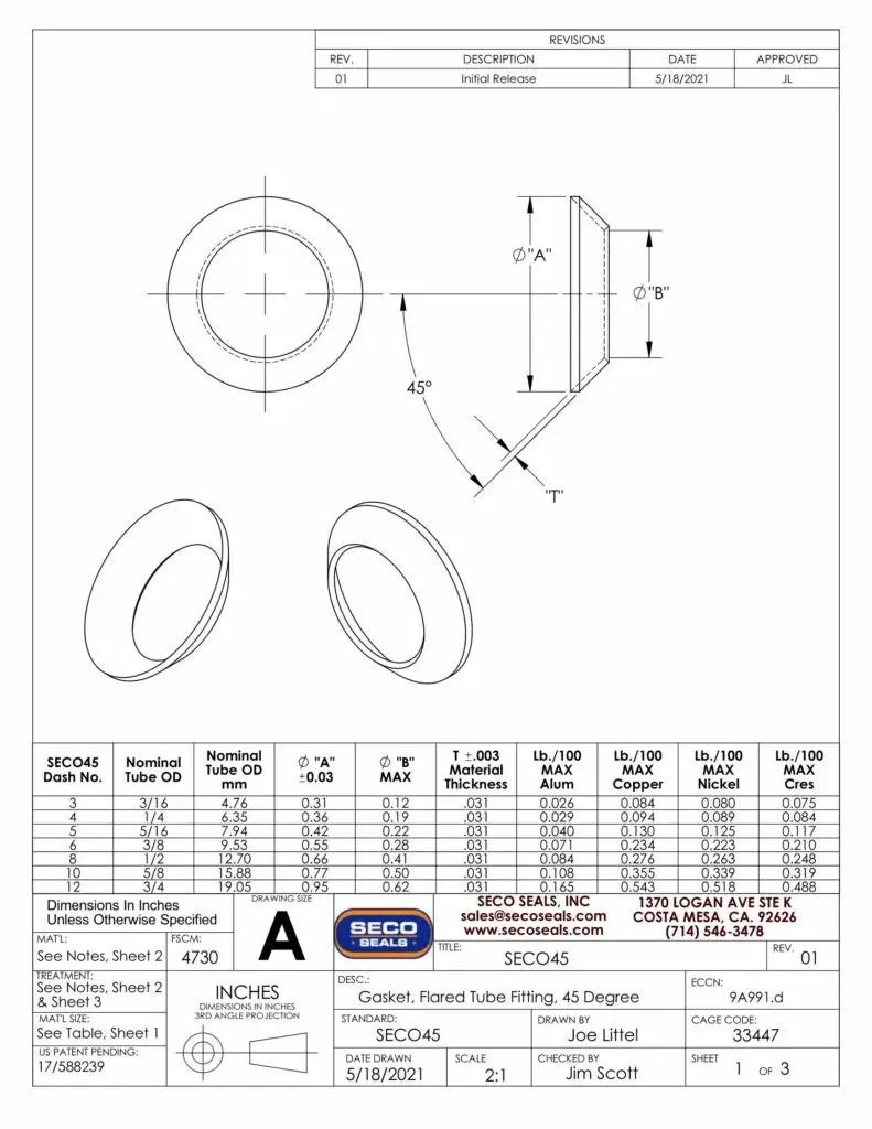SECO SEALS is introducing a new product line, SECO45, US Patent Pending, of 45-degree copper flare fitting gaskets. They are made of Copper (Per ASTM B152 and ASTM B 152M) and conform to ASE Standard J513_201912, “Refrigeration Tube Fittings – General Specifications” for general use with flared annealed copper tubing in refrigeration applications. SECO45 conical seals are available with optional “Tin” or “Silver” plating.