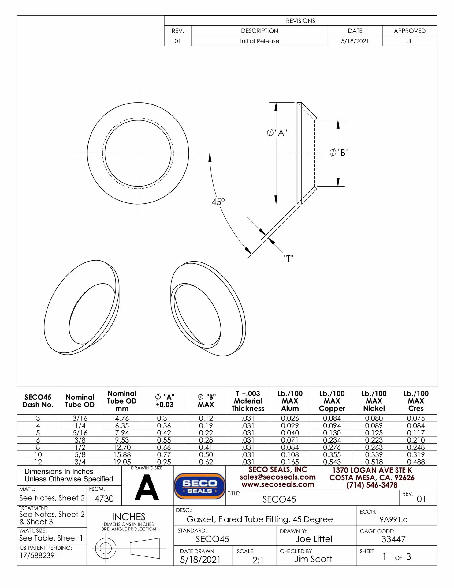 Below are the US Patent submission documentation for our US SECO45 product line of 45-degree copper flare fitting gaskets. They can be viewed online or downloaded.