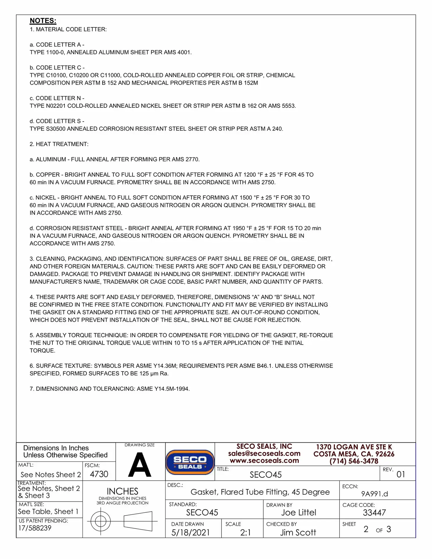 Page 2 of the SECO45 information PDF has Notes 1 through 7, Material and Finish, Cleaning and Packaging data for SECO45 45-Degree Flared Tube Fitting Conical Seals.