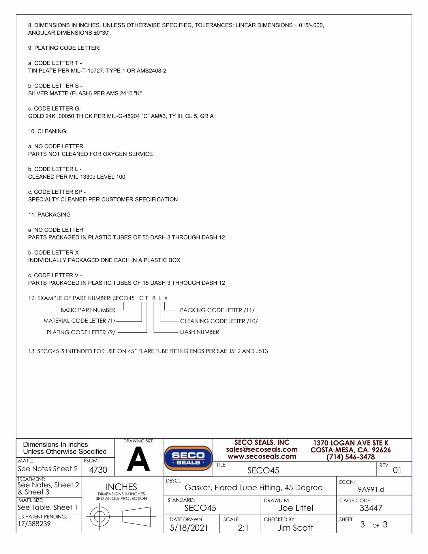 Page 3 of the SECO45 information PDF has Notes 8 through 12, Material and Finish, Cleaning and Packaging data for SECO45-45 Degree Flared Tube Fitting Conical Seals.