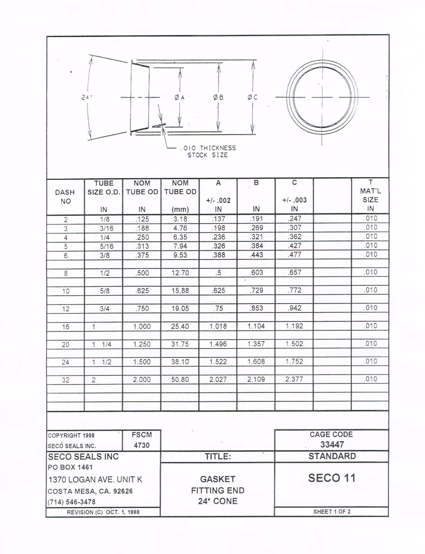Page 1 of the information PDF provides complete sizing information and tolerances for SECO11 24 Degree Flareless Tube Fitting Gaskets.