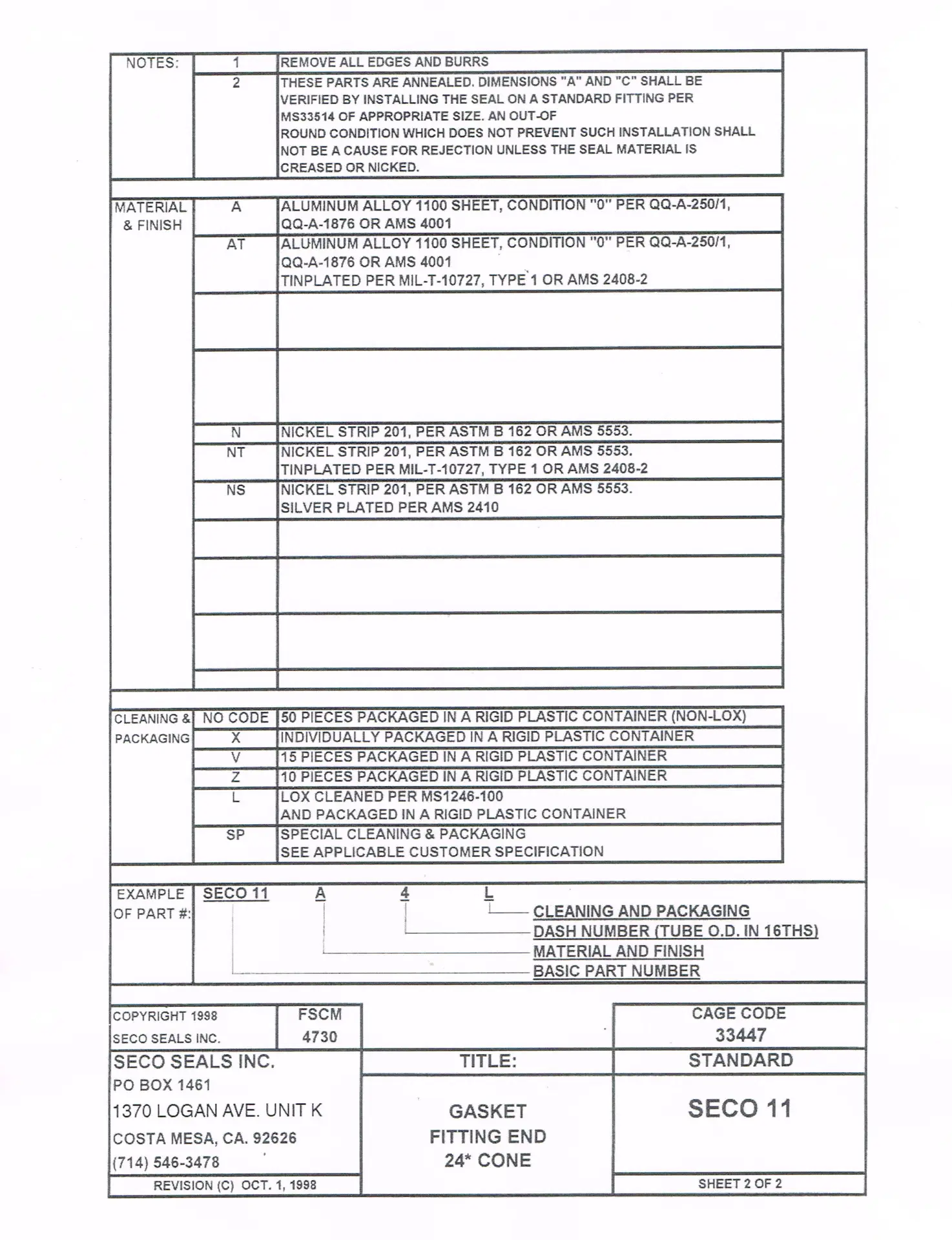 Page 2 of the SECO11 information PDF has Notes, Material and Finish, Cleaning and Packaging data for SECO11 24 Degree Flareless Tube Fitting Gaskets.
