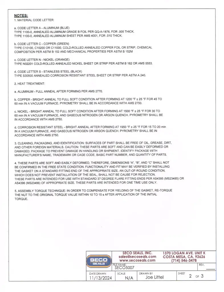 Page 2 of the information PDF has Notes 1 through 5: 1) Material Code Letter; 2) Heat Treatment; 3) Cleaning, Packaging,and Identification; 4) Functionality and Fit Verification; and 5) Assembly Torque Technique for SECO5007 37-Degree Flared Tube Fitting Conical Seals.