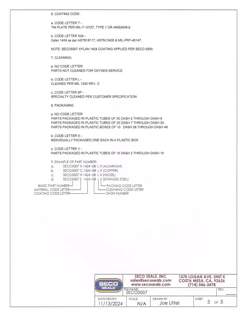 Page 3 of the information PDF has Notes 6 through 9: 6) Coating Code; 7) Cleaning; 8) Packaging; and 9) Example of Part Number for SECO5007 37-Degree Flared Tube Fitting Conical Seals.