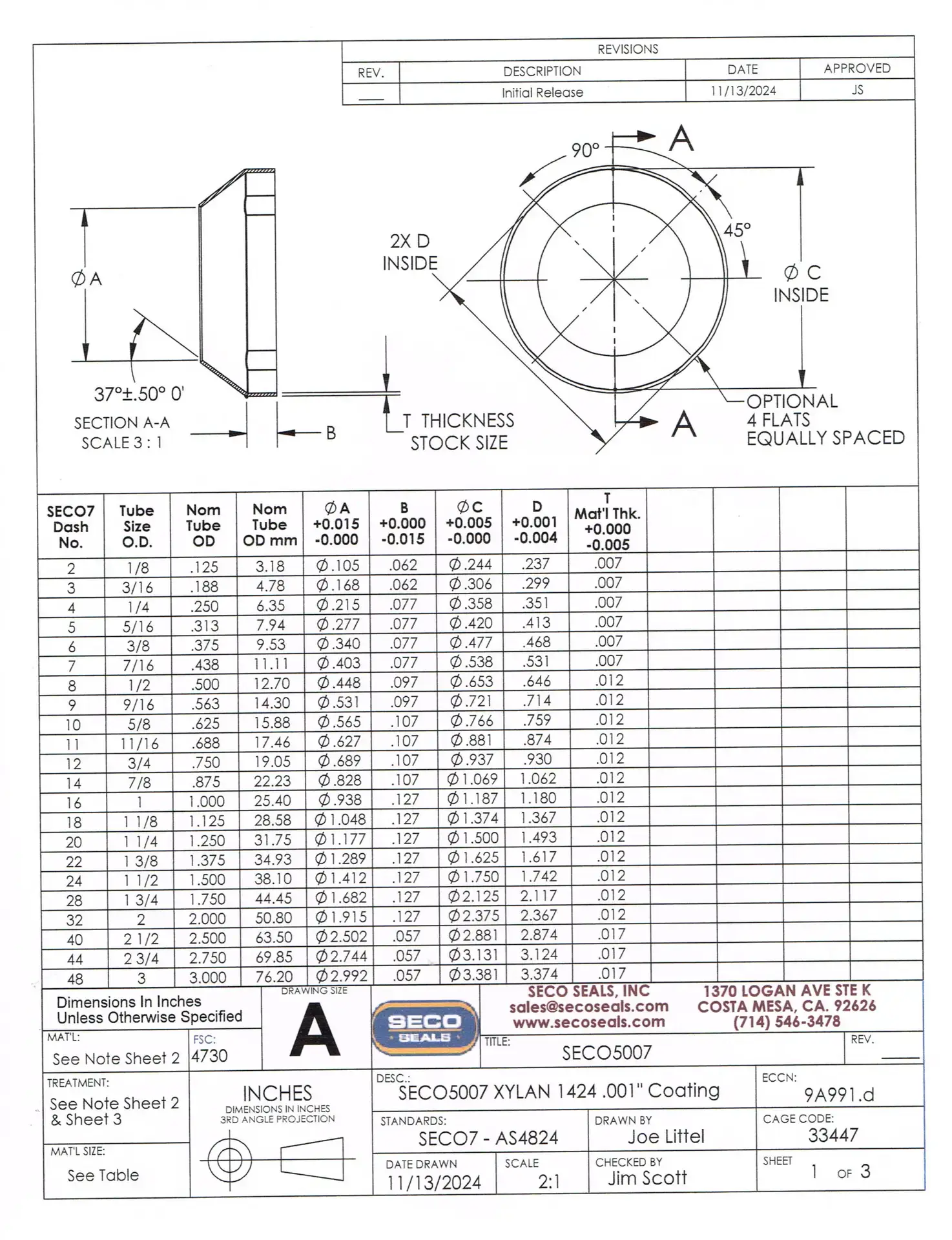 Page 1 of the SECO5007 information PDF provides complete sizing information and tolerances for SECO5007 37-Degree Flared Tube Fitting Conical Seals.